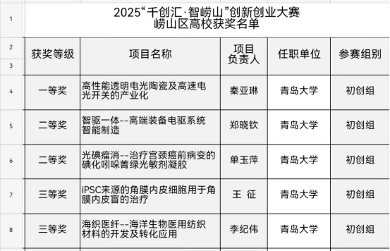 近日,由崂山区主办的2025“千创汇·智崂山”创新创业大赛圆满落幕。我校在本届大赛中表现亮眼,共有五个项目脱颖而出,分别荣获一等奖1项、二等奖1项、三等奖3项,展现了学校在科技创新与产学研融合方面的雄厚实力和育人成果。